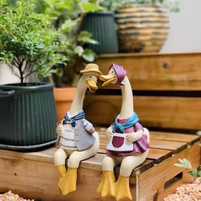Material: Resina Tamanho: comprimento 9 cm, largura 8 cm, comprimento da perna 6,5 cm Peso: 700 g ['Charming Couple Design: com dois patos vestidos em roupas vintage, este conjunto de bonecos dá um toque divertido e reconfortante à decoração de jardins e displays internos. ', 'Artesanato em resina fina: feita de resina durável, cada estátua mostra expressões faciais detalhadas, texturas de roupas e acabamentos suaves, ideais para uso a longo prazo. ', 'Estilo de assento estável: projetados para caber em prateleiras, vasos, saliências ou bordas de cercas, esses ornamentos adicionam personalidade a pátios, varandas e decoração de salas de estar. ', 'Uso decorativo versátil: adequado para paisagens externas, entradas residenciais, displays de mesa ou cenas temáticas, aprimorando a estética rústica e extravagante. ', 'Coloridas e atraentes: com roupas em tons pastel e pés brilhantes, essas figuras de patos criam um ponto focal alegre, perfeito para configurações ornamentais sazonais ou diárias.']