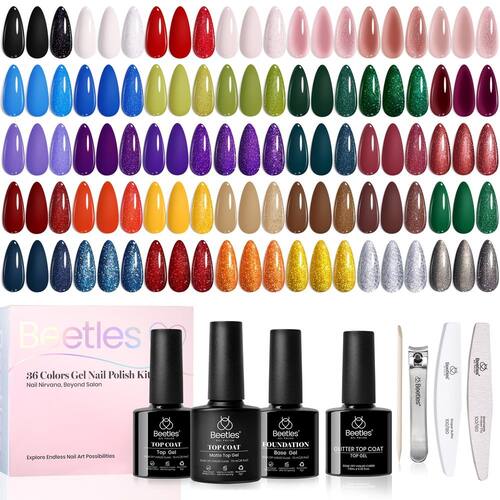 Be Bold, Be You, Be Beetles - Kit de unhas em gel com 36 cores: esmalte de gel Beetles incluindo 36 cores clássicas e modernas, 4 x base sem pano e revestimento brilhante e fosco e holográfico com glitter, 1 protetor de unha, 1 lixa de unha, 1 cortador de unha, 1 x bastão de madeira, para todas as ocasiões e estações. - Brilho de longa duração: pode durar pelo menos 28 dias com nosso esmalte de gel de imersão UV/LED. Com cura rápida sob uma lâmpada e técnicas de aplicação adequadas, suas unhas manterão um brilho vibrante. Cura por 60 a 120 segundos para melhores resultados. - Fornece inspiração de moda: destaque-se com o conjunto de esmaltes de gel com uma variedade de tons de geleia, verde, azul, laranja, vermelho, marrom, roxo, etc. Seja para uso diário, passeios casuais ou eventos especiais, as cores deste kit complementarão qualquer estilo de unha que você desejar. - Perfeito para conjuntos de presentes de beleza: este kit é perfeito para feriados, aniversários, aniversários ou como um presente surpresa para um amigo ou ente querido. Nosso grande conjunto de esmaltes é perfeito para iniciantes! Você não precisa ser um especialista em unhas para criar seu próprio visual exclusivo. - Aviso: pode produzir uma reação alérgica por contato com a pele. Leia as instruções de uso cuidadosamente. Apenas para uso intenso. utilizado apenas para unhas. Evite contato com olhos, boca e pele. Enxágue imediatamente se o produto entrar em contato com eles. Se houver algum incidente, com o médico imediatamente.