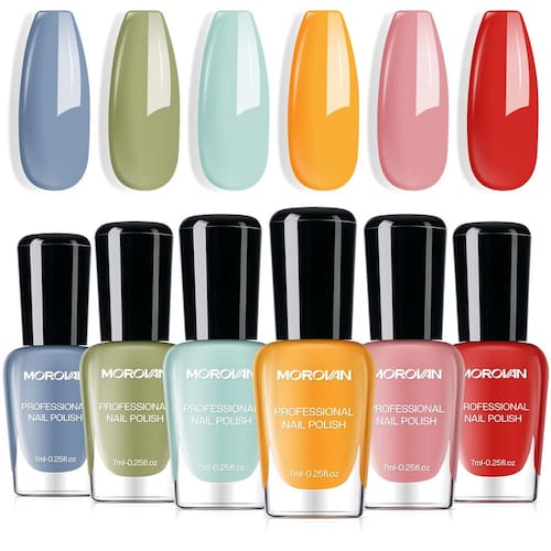 Morovan Conjunto de esmaltes de unhas com rosa, laranja, azul, vermelho, verde kit de esmalte seco ao ar livre, adequado para pacote de esmalte regular de primavera e verão. É um ótimo presente para mulheres, filhas, salão de esmalte DIY em casa. - Morovan Conjunto de esmaltes de unhas: o conjunto de 6 cores diárias com autonivelamento e secagem a ar tem fórmula única, inofensiva e sem necessidade de lâmpada UV. A maioria das cores de estilo diário, mas moderno, cheio e natural, traz uma aplicação suave. Este kit de esmalte de unha pode economizar seu precioso tempo e também evitar que a pele fique preta e danifique as unhas. - Esquema de cores e aplicação exclusivos: o kit de esmalte de secagem rápida de 7 g tem alta capacidade do que outros no mercado, permitindo mais ideias de correspondência de esmalte. Você pode usá-lo como esmalte de unha, esmalte de unha com glitter regular ou sozinho para criar um estilo diferente. (Presente perfeito: conjunto de esmaltes para mulheres, meninas, amantes de esmaltes.) - Ecológico e autonivelante rápido: o esmalte de outono usa fórmula não perigosa que dura, mas não danifica as unhas. Mais seguro e saudável. Esmalte de inverno sem gel, sem necessidade de cozimento na lâmpada. A operação simples em casa também pode fazer você mesmo suas unhas, perceber sua inspiração. - Adequado para iniciantes: o pacote de esmalte Morovan exclusivo pincel fácil de deslizar se encaixa em todos os tamanhos de unha e permite uma aplicação rápida, sem riscos, uniforme e profissional em casa. Cobertura impecável da cor das unhas e durabilidade a cada pincelada. - MELHOR SERVIÇO: Prometemos fornecer a todos os nossos clientes um excelente conjunto de esmaltes e serviços. Se houver algum problema com este conjunto de esmaltes de unha, não hesite em entrar em contato conosco e faremos o nosso melhor para ajudá-lo a resolver o problema. O serviço de substituição ou reembolso está sempre disponível. Obrigado e aproveite sua jornada de beleza.