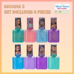 - O conjunto inclui: 8 esmaltes de chiclete perfumados e descascáveis nas cores frias e divertidas de azul escuro e claro, glitter roxo, roxo claro e escuro, glitter rosa, glitter verde e azul-petróleo - cada garrafa enfeitada com Moana e suas amigas.