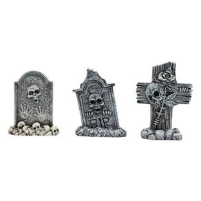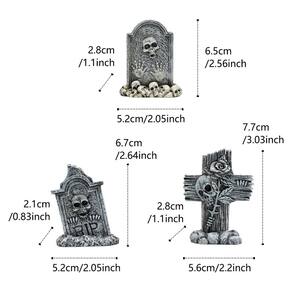 Material: Resina Tamanho: 2,1-7,7 cm. Consulte a imagem para obter detalhes de tamanho específico. Peso: 120 g [Design de lápide de 3 peças] — Inclui três minifiguras exclusivas de lápides com caveiras, ossos e gravuras RIP, criando uma atmosfera assustadora de Halloween para a decoração do seu jardim. ', 'Construção durável em resina — Feita de resina de alta qualidade com textura realista de pedra e detalhes envelhecidos, garantindo durabilidade duradoura para exibições de Halloween internas ou externas. ', 'Tamanho decorativo compacto — Cada boneco mede entre 2,1—7,7 cm, perfeitamente dimensionado para micropaisagens, mesas, gramados ou arranjos de pátio sem ocupar muito espaço. ', 'Artesanato realista — o acabamento pintado à mão com tons de cinza envelhecido e textura fina adiciona autenticidade, fazendo com que esses ornamentos se destaquem em qualquer arranjo assustador. ', 'Ornamentos versáteis de Halloween — Ideais para jardins, casas mal-assombradas ou interiores de casas, essas estátuas aprimoram sua atmosfera sazonal e complementam outras decorações de Halloween.']