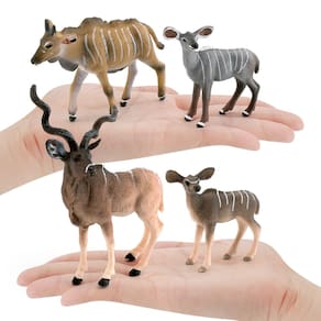 Conjunto de 4 peças de estatuetas realistas de antílope kudu — bonecos de animais selvagens em PVC, brinquedos educativos realistas para crianças, perfeitos para decorar, aprender e colecionar a vida selvagem africana Descrição: Material: PVC Tamanho: 3-12 cm Peso: 150 g Características: Estatuetas autênticas de antílope kudu — Este conjunto apresenta quatro modelos realistas de antílope kudu, incluindo adultos e bezerros, com detalhes realistas para capturar sua beleza natural. Construção em PVC de alta qualidade — Feitas de material de PVC durável e seguro, essas bonecas são perfeitas para crianças de 3 anos ou mais e são feitas para suportar horas de brincadeiras educacionais e criativas. Conjunto de brinquedos educativos para a vida selvagem — Ideal para ensinar crianças sobre a vida selvagem africana, essas estatuetas de antílope oferecem uma maneira divertida e interativa de aprender sobre a natureza e o comportamento animal. Perfeitas para exibições e decorações — Essas estatuetas kudu requintadas são adições impressionantes a qualquer decoração de casa ou sala de aula, dando um toque exótico a qualquer espaço com sua aparência realista. Ótimas para colecionadores de animais — Com suas características realistas e cores vibrantes, essas estatuetas são um ótimo complemento para qualquer coleção de animais selvagens africanos ou estatuetas de animais, perfeitas para colecionadores. O que vem na caixa: 4 x Conjunto de estatuetas realistas de antílope Kudu