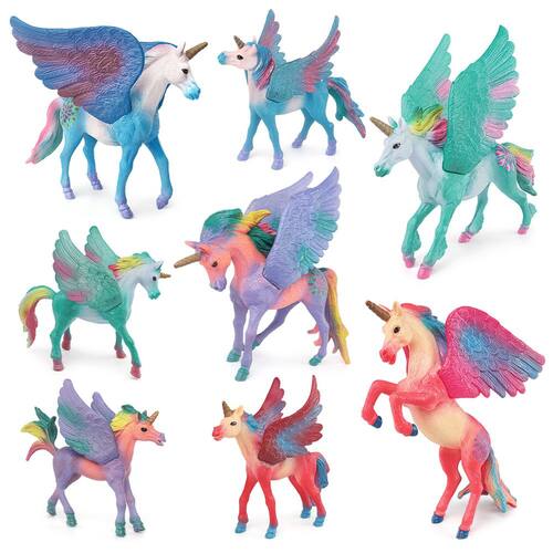 Conjunto de 8 peças de estatuetas de unicórnio alado — unicórnios voadores coloridos de PVC com asas mágicas, criaturas míticas para crianças, figuras de animais fantásticos para brinquedos e decorações Descrição: Material: PVC Tamanho: 4,8-16 cm, consulte a imagem para obter detalhes específicos de tamanho Peso: 850 g Características: Unicórnios alados mágicos: este conjunto apresenta nove estatuetas vibrantes de unicórnios com asas lindas e coloridas, oferecendo uma representação mágica de criaturas fantásticas em várias poses. Brincadeiras imaginativas: ideais para crianças, esses unicórnios inspiram histórias criativas e brincadeiras imaginativas, promovendo a exploração do mundo de fantasia e o reconhecimento de animais. Seguras e duráveis: feitas de PVC de alta qualidade, essas estatuetas são atóxicas, resistentes e projetadas para durar, garantindo longas horas de diversão para as crianças. Perfeito para colecionadores: os entusiastas da fantasia e dos unicórnios apreciarão os detalhes intrincados dessas figuras, tornando-as um ótimo complemento para qualquer coleção ou exibição. Decoração versátil: essas figuras de unicórnio também podem ser usadas como decoração encantadora para creches, quartos infantis ou espaços com temas de fantasia, criando uma atmosfera mágica. O que vem na caixa: 8 x Conjunto de estatuetas de unicórnio alado