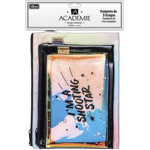 O conjunto Slim vem com três estojos nos tamanhos grande 196 x 254 x 5 mm , médio 164 x 228 x 5 mm e pequeno 133 x 203 x 5 mm . As opções podem ser utilizadas para guardar itens da escola, escritório e outros acessórios do dia a dia. Os modelos, com zíper e produzidos com materiais resistentes e de fácil limpeza, possuem cores, acabamentos e estampas baseadas nas mais recentes tendências de consumo. Detalhes Compartimento: um Detalhe: glitter, holográfico e silkscreen Fechamento: em zíper Material: PU e PVC holográfico Puxador: em metal Formato: L 254mm x A 196mm x P 5mm Marca: Não Informado