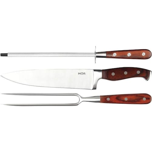 Descrição O Conjunto de Faca, Garfo e Chaira da linha Steel da Mor tem design sofisticado e atraente. Desenvolvidos com cabo em madeira tratada e corpo em aço inoxidável, materiais que proporcionam maior resistência, leveza e durabilidade, são perfeitos para auxiliar os chefs mais exigentes. Embalado em uma caixa de muito bom gosto, esse conjunto é uma excelente opção para presentear os amigos. Especificações MATERIAL Madeira INFORMAÇÕES IMPORTANTES 01 Faca - 33cm x 4,5cm x 2cm 01 Caixa - 36,5cm x 17cm x 3cm 01 Garfo - 31cm x 2,5cm x 1,5cm 01 Chaira - 32,5cm x 3,5cm x 1,5cm OBSERVAÇÕES Os objetos que ambientam as imagens não acompanham o produto! ALTURA 3,00 Centímetros LARGURA 17,00 Centímetros COMPRIMENTO 36,70 Centímetros PESO 549,00 Gramas