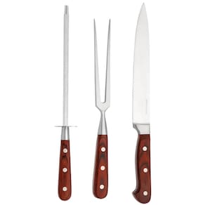 A Faca que compõe esse kit é essencial para diferentes funções em sua cozinha, garantindo mais eficiência em cortar, fatiar e picar os mais variados tipos de alimentos, desde peixe, frango, carnes bovina e suína, até frutas, legumes e verduras. O Garfo Trinchante é ideal para auxiliar no preparo do churrasco, carnes assadas no forno, peixes e verduras no geral, sendo um coringa para preparar diferentes tipos de receitas e para auxiliar o momento de servir seus convidados. Já a Chaira é perfeita para manter o fio de corte e afiar diferentes tipos de facas. Ambas as peças são fabricadas em Aço Inoxidável super eficiente para diferentes texturas, garantindo um manuseio preciso, e os cabos são fabricados em Madeira de alta qualidade.