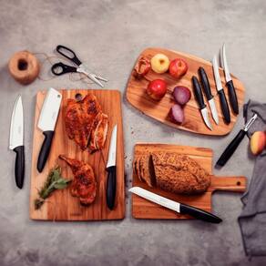 O jogo conta com 1 faca para churrasco, 1 faca de pão, 1 faca para frutas e legumes, 1 faca de tornear, 1 descascador de batatas, 1 faca para tomates, 1 faca do chef, 1 faca para desossar, 1 cutelo e até uma tesoura para facilitar seu dia a dia na cozinha. Aproveite a liberdade de escolha e desperte o chef que existe em você!