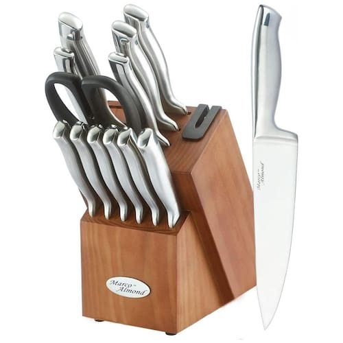 Conjunto de facas afiadas com bloco e afiador embutido. Marco Almond O conjunto de facas de 14 peças inclui faca de cozinha 1 peça 20,32cm, faca de corte 1 peça 20,32cm, faca de pão 1 peça 20,32cm, 1 peça 18cm, Faca Santoku, 1 peça 12cm, Faca de serviço, 1 peça 9cm, Faca para aparar, 6 peças 11,43cm, Facas para bife, tesoura de cozinha multifuncional de 1 peça, bloco de faca de madeira de 1 peça. O bloco de madeira é um amolador embutido para facas auto afiadoras que é super conveniente para uso diário e profissional. Facas de peça única forjadas de aço inoxidável O conjunto de facas inteiras é de peça única forjada de aço inoxidável, o que reduz a aderência e facilita a limpeza. Peso otimizado e bom equilíbrio fazem com que se encaixem perfeitamente na palma da mão de mão. Recomendar facas limpas com água e sabão, secar com papel toalha. Os cabos também são ergonomicamente projetados para proporcionar conforto e aderência perfeita. Conjunto de facas de cozinha Premium. Os conjuntos de facas Marco Amêndoa são feitos de aço inoxidável de alto carbono que é ferrugem prova e durável. Perfeito para profissionais e iniciantes. Sem ferrugem, manchas e corrosão aqui O design forjado de peça única torna as facas resistentes o suficiente para mantê las duráveis por vários anos. e natural Nenhum dos materiais s nas facas Marco Almond é perigoso para a saúde. Aço inoxidável e bloco não existem quaisquer partículas tóxicas. O conjunto de facas é enviado em uma caixa biodegradável e cada uma das facas vem com uma bainha de segurança que garante total segurança durante o transporte e no uso diário. Todas as nossas facas estão de acordo com a avaliação do FDA de que você pode usá las com segurança Marca: Não Informado