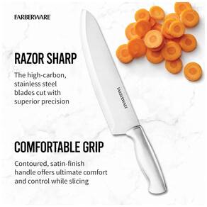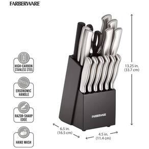 Conjunto de blocos de 15 facas. Este conjunto inclui uma faca de chef , Faca de pão , Faca cortadora, 4 Santoku, Faca serrilhada Santoku, Faca de aparar. Também inclui este conjunto também 6 4 Facas para carne, um par de tesouras de cozinha para todos os fins, uma haste de afiar e um bloco de zenamento de madeira preta Lâmina de alta qualidade, cada lâmina é habilmente trabalhada com aço inoxidável de alto carbono e qualidade superior, que garante que as lâminas retenham Sua borda ultra afiada mais do que o aço inoxidável convencional e fornece resultados precisos. Alça confortável Com acabamento acetinado As alças são fabricadas em aço inoxidável e projetadas ergonomicamente para uma alça confortável, cada faca é perfeitamente equilibrada para precisão durante o corte. Lavagem fácil com água morna e uma lavagem com detergente neutro e uma secagem imediata por toda a vida útil Todas as facas possuem lâminas de aço inoxidável de alto carbono que garantem as lâminas retenha sua borda ultra nítida por mais tempo do que o aço inoxidável convencional Cada faca possui uma alça de aço escovada ergonômica para maior durabilidade Não pode ser lavado na máquina de lavar louça Marca: Não Informado