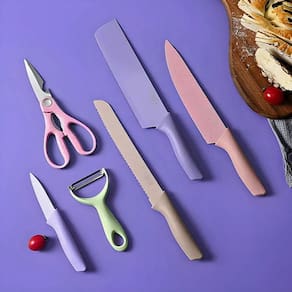 Conjunto de Facas 6 Peças em Aço Inoxidável Colorido com Tesoura e Descascador