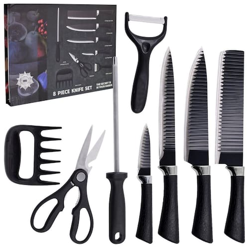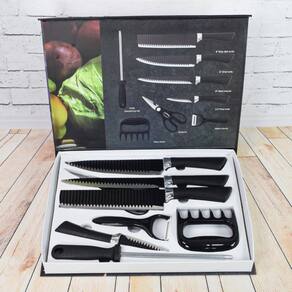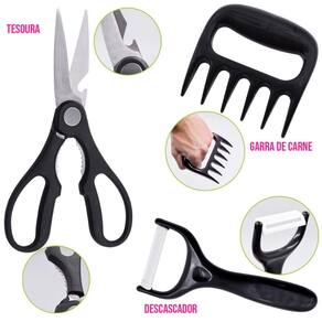 Itens inclusos: - 1 faca de corte de carne - 1 faca do chef - 1 faca de descascar - 1 descascador de legumes - 1 tesoura - 1 amolador de faca - 1 cutelo - 1 garra de carne Ean: 7892201232082 Marca: Não Informado