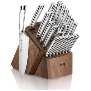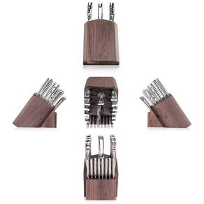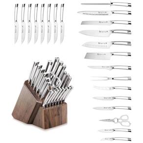Facas full tang artesanais forjadas em aço alemão X50CrMoV15 de grão fino para incrível durabilidade, resistência a manchas e retenção de borda excepcional. Cada lâmina passa por um tratamento térmico ultra6 de estágio, garantindo que cada lâmina mantenha sua força e função. HRC 58 , 2 na Escala de Dureza Rockwell. Bloco de madeira de nogueira maciça funciona com as facas com bom gosto, cada bloco é feito à mão e tem seu próprio grão único Certificado internacional NSF. Garantia vitalícia contra defeitos de fabricação. Lave as facas com água morna e um pouco de detergente, enxágue com cuidado e seque com uma toalha Marca: Não Informado