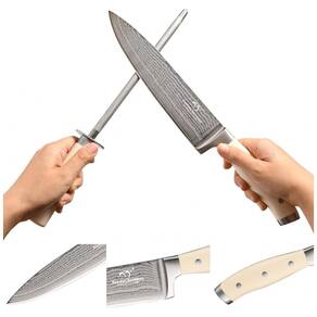 CONJUNTO COMPLETO TUDO EM UM O conjunto profissional de facas de Damasco inclui faca de chef de 20,32 centímetros, faca de corte de 20,32 centímetros, faca de pão de 20,32 centímetros, faca Santoku de 17,78 centímetros, 6 peças de facas de bife de 12,07 centímetros, faca de aparar de 8,89 centímetros, tesoura de cozinha, afiador de faca para ficar afiado e bloco de madeira.