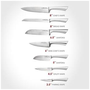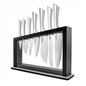 O conjunto de facas Cuisine::pro Damashiro Satori de 8 peças utiliza aço inoxidável japonês 420J2 forjado integralmente, com tratamento de endurecimento a gelo e têmpera a 53 HRC para manutenção de fio em ângulo de 15-20 graus, adequado para cortes precisos em cozinhas domésticas ou profissionais. O bloco em madeira de acácia organiza as facas com design equilibrado via cabos ocos ponderados. Lâminas em aço inoxidável 420J2 com padrão inspirado em damasco, afiadas por processo tradicional japonês com couro e bisel duplo cônico. Tecnologias incluem construção monolítica de uma peça única, endurecimento a gelo e têmpera para dureza Rockwell 53 HRC. Funcionalidades abrangem afiação precisa com ângulo de 15-20 graus e equilíbrio via cabos ocos em aço inoxidável. Não compatível com lavagem em lava-louças; requer cuidados manuais para preservação. Cuidados envolvem lavagem à mão, secagem imediata e armazenamento no bloco de acácia. Manual em inglês.