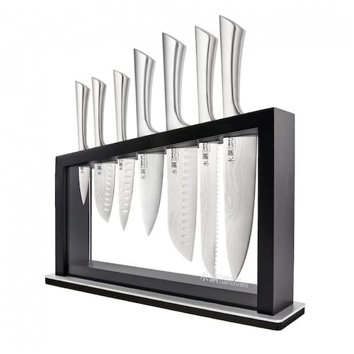Ficha Técnica • Peso do produto: 6 kg • Capacidade: 8 peças (facas com lâminas inspiradas em damasco + bloco em acácia)? • Material da lâmina: aço inoxidável japonês 420J2? • Material do cabo: aço inoxidável (oco ponderado)? • Material do bloco: madeira de acácia? • Faixa etária: adulto? • Lavagem: não compatível com lava-louças (manual recomendada)? • Conteúdo da caixa: 8 peças de facas, bloco em madeira de acácia? • Manual do usuário: inglês Marca: Não Informado