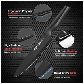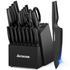 O conjunto de facas de cozinha Astercook de 21 peças em aço inoxidável de alto carbono alemão 1.4116 oferece lâminas forjadas com revestimento preto antiaderente e afiador embutido no bloco de madeira dura para manutenção prática do fio em preparos domésticos extensos. A tecnologia de afiação cônica progressiva proporciona cortes precisos em carnes, vegetais, pães, queijos e frutas. Cabos em TPR/PU ergonômicos promovem aderência segura durante uso prolongado.