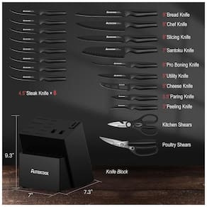 • Capacidade: 21 peças (1 chef 20 cm, 1 fatiadora 20 cm, 1 santoku 18 cm, 1 pão serrilhada 20 cm, 1 utilitária 13 cm, 1 aparar 9 cm, 1 descascar 8 cm, 1 desossar 15 cm, 1 queijo 13 cm, 8 bife serrilhadas 11 cm, 1 tesoura aves, 1 tesoura cozinha, 1 bloco com afiador)?