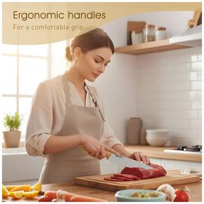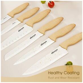 O conjunto de facas de cozinha elitequo de 6 peças em aço inoxidável de alto carbono oferece lâminas estampadas com revestimento antiaderente para cortes suaves em alimentos variados durante preparos diários, adequado para espaços compactos ou armazenamento em gavetas. Inclui bainhas protetoras individuais para proteção das lâminas e portabilidade. Cabos em plástico com padrão madeira e TPR ergonômicos promovem aderência segura mesmo com mãos úmidas. Lâminas em aço inoxidável de alto carbono com acabamento speckled antiaderente e bordas lisas resistem à oxidação e formação de resíduos. Construção estampada mantém peso leve com rigidez funcional. Cabos em plástico/TPR com contorno ergonômico e textura antiderrapante reduzem fadiga em usos frequentes. Design imita madeira para estética de bancada. Tecnologias incluem revestimento antiaderente para deslizamento de alimentos e bainhas para armazenamento seguro sem ocupar espaço excessivo. Funcionalidades abrangem facas para picar, fatiar e descascar com bainhas individuais para proteção e organização em gavetas ou bolsas. Não compatível com lavagem em lava-louças; requer cuidados manuais para preservação do revestimento e afiação. Cuidados envolvem lavagem à mão com esponja suave, secagem imediata e armazenamento com bainhas protetoras. Manual em inglês.