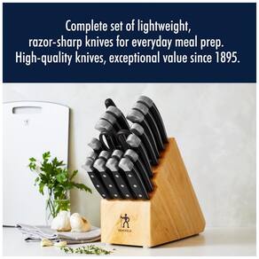 O conjunto de facas de cozinha HENCKELS Statement de 20 peças oferece lâminas em aço inoxidável com afiação fina e serrilhada para cortes precisos em preparos domésticos completos, incluindo carnes, vegetais, pães e desossa. O bloco organizador armazena as facas com proteção adequada e inclui aço de afiação 23 cm e afiador bônus para manutenção do fio. Construção full tang com cabos plásticos tradicionais proporciona equilíbrio e manobrabilidade em uso diário.