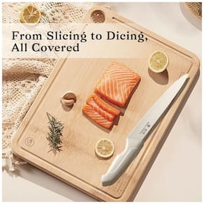 Lâminas em aço inoxidável de alto carbono com bordas lisas e serrilhadas resistem à corrosão e aderência de alimentos. Construção forjada assegura distribuição uniforme de peso.