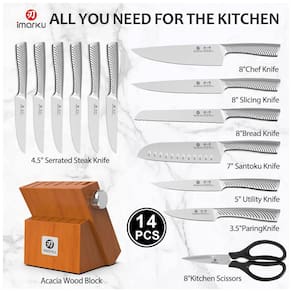 • Capacidade: 14 peças (1 faca chef 20 cm, 1 santoku 18 cm, 1 faca para pão 20 cm, 1 faca fatiadora 20 cm, 1 faca de aparar 9 cm, 1 faca utilitária 13 cm, 6 facas para bife serrilhadas 11 cm, 1 tesoura de cozinha, 1 bloco FSC)?