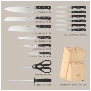 O conjunto de facas de cozinha Martha Stewart Carverton de 15 peças em aço inoxidável de alto carbono oferece lâminas forjadas full tang com distribuição uniforme de peso para equilíbrio em cortes variados de carnes, vegetais, pães e frutas, adequado para preparos domésticos diários. Inclui bloco em madeira de borracha para organização e aço de afiação para manutenção do fio. Cabos em ABS com três rebites promovem aderência firme em formato tradicional reto.