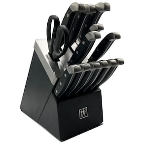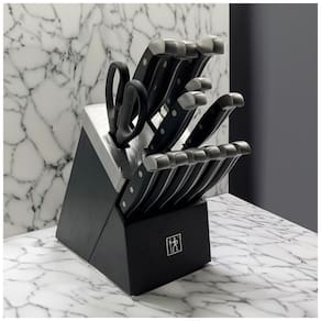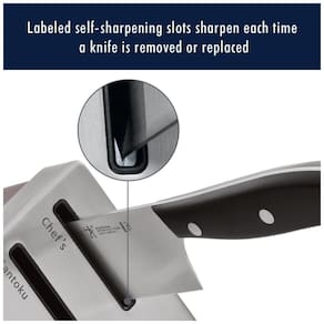 USO A faca para descascar permite que você corte ao longo da pele de frutas e vegetais. A Faca do Chef é útil em tudo, desde pequenos vegetais até carne. A lâmina serrilhada do Bread Knife corta o pão sem esmagá lo. A faca utilitária é perfeita para cortar frutas, legumes e pequenos pedaços de peixe e carne. A faca Santoku para todos os fins é perfeita para todos os tipos de corte e fatiamento. E não há muito que você não possa picar, cortar em cubos ou fatiar com a Faca de Preparação BÔNUS O belo bloco de madeira mantém esta útil coleção de facas ao seu alcance em sua bancada. As ranhuras auto afiáveis possuem rodas de afiação de cerâmica integradas que afiam automaticamente quando as facas são zenadas ou removidas. As ranhuras restantes são para facas serrilhadas, cujas lâminas dentadas nunca precisam ser afiadas. Além das facas especiais, este conjunto vem com e zena elegantemente seis facas de bife e um par de tesouras de cozinha, que são práticas e versáteis nas tarefas de cozimento. ALÇAS Com a alça tradicional de rebite triplo ergonômica, desfrute da máxima manobrabilidade e corte sem fadiga. Curvadas para maior conforto, as alças de rebite triplo à prova de quebra são agradáveis de segurar, dando a você o controle necessário para cortar cortes mais difíceis com facilidade. Com uma transição perfeita da lâmina para o cabo, a construção totalmente forjada das facas proporciona um equilíbrio maravilhoso Marca: Não Informado