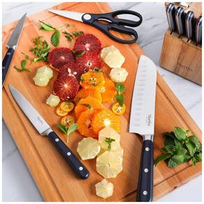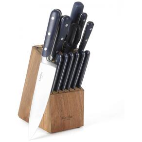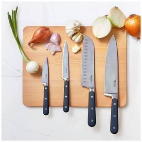 LÂMINAS DE ALTO CARBONO Facas de aço inoxidável forjado com construção full tang para equilíbrio e durabilidade. PEGAS ERGONÓMICAS Pegas com rebites triplos em azul contemporâneo. BLOCO DE FACAS RESISTENTE Bloco de facas de madeira de acácia zena facas com segurança. INSTRUÇÕES DE CUIDADOS Lavar apenas à mão. Para limpar o bloco de madeira, passe um pano macio e úmido Marca: Não Informado