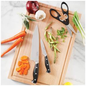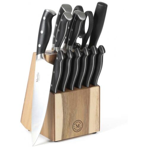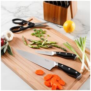 LÂMINAS DE ALTO CARBONO Facas forjadas de aço inoxidável com construção full tang. ALÇAS ERGONÔMICAS Alças rebitadas para oferecer resistência e conforto ao cortar, picar, picar e muito mais. BLOCO DE FACAS DE MADEIRA DE ACÁCIA RESISTENTE O bloco de facas de madeira durável zena as facas com segurança. INSTRUÇÕES DE CUIDADOS Lavar apenas à mão. Para limpar o bloco de madeira, passe um pano macio e úmido Marca: Não Informado