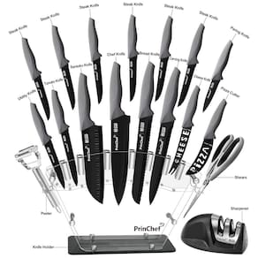 Nitidez é a chave Cansado de usar suas velhas facas de cozinha rombas É hora de substituí los por uma nova faca afiada com amolador Forjadas em aço inoxidável de alto carbono premium, polido à mão 15 por artesãos habilidosos, todas as facas apresentam nitidez máxima para cortes precisos. Inclui um amolador de facas, para uma boa manutenção e aumentar a nitidez A qualidade leva à perfeição A dureza Rockwell de 56 2 HRC e o design de uma peça garantem grande durabilidade. Todas as facas são revestidas com revestimento antiaderente preto, para evitar qualquer ferrugem e reduzir a aderência dos alimentos. Usando uma técnica atualizada, o revestimento é 2 vezes mais forte do que os normais, não sendo fácil de ser riscado como outras marcas. Comfort Style Win Todas as facas têm um peso adequado, excelente para velocidade e precisão. O cabo de borracha oferece uma pegada confortável, tirando a pressão da torção e garantindo o mínimo de fadiga. Lâmina preta com cabo cinza parece mais elegante e combina bem com sua cozinha moderna. Todos os que visitam a sua cozinha vão elogiar a sua excelente estética Marca: Não Informado
