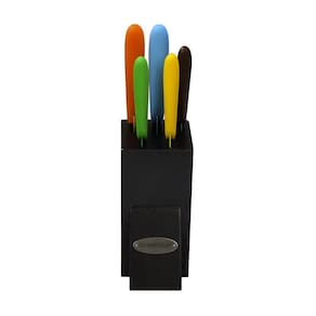 KS1217 Características Material de aço inoxidável de alto carbono com revestimento antiaderente. Os alimentos deslizam facilmente da lâmina revestida com antiaderente em comparação com a lâmina de aço inoxidável. Alça ergonômica. O bloco de zenamento de madeira de cinco slots mantém suas facas organizadas, seguras e prontas para uso. Limpeza e cuidados Recomendamos a limpeza manual com água quente e sabão para manter as facas em perfeitas condições Marca: Não Informado
