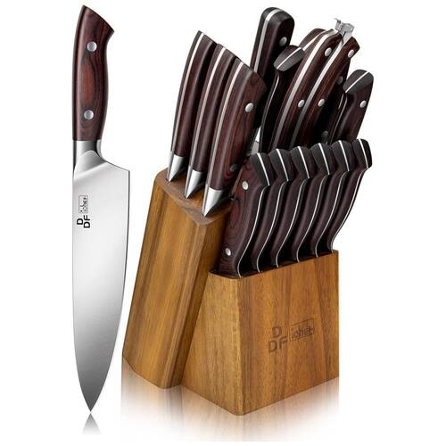 1: Todas as facas são bem organizadas em 1 bloco de madeira, mantendo sua cozinha arrumada e economizando espaço, a parte superior e inferior das ranhuras das lâminas são passadas para ventilação, ajudando as lâminas a drenar rapidamente e permanecer secas. 2: Conjunto de facas DDF iohEF para cozinha com bloco inclui faca de chef de 20,32 centímetros, faca Santoku de 17,78 centímetros, faca de pão de 20,32 centímetros, faca de corte de 20,32 centímetros, faca de filé de 17,78 centímetros, faca utilitária de 15,24 centímetros, 9,53 centímetros Faca de descascar, conjunto de 6 facas para bife de 11,43 centímetros, tesoura de cozinha, haste de afiar faca e um bloco de madeira. Este conjunto de facas pode ser para suas tarefas diárias de cozinha e atender a todas as suas necessidades. 3: A lâmina de cada faca DDF iohEF é construída em aço japonês de alto carbono para excelente proteção contra ferrugem e corrosão, e é meticulosamente polida à mão e tecnologia de têmpera precisa para nitidez duradoura e fácil afiação. 4: O equilíbrio entre a lâmina e o cabo é bastante bem equilibrado. A alça ergonômica Pakkawood reduz bastante a tensão do pulso e cria uma pegada macia e confortável e proporciona desempenho antiderrapante Marca: Não Informado