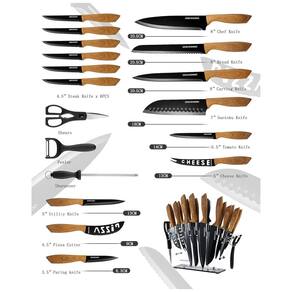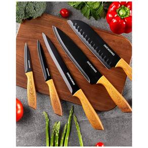 Matéria prima de qualidade e lâminas afiadas feitas de aço inoxidável de alto carbono 3CR14 é forjado a partir de uma peça sólida de aço Processa o aço de uma maneira específica para garantir que tenha uma alta dureza de 52 Rockwell. Isso faz com que cada faca tenha extrema nitidez, resistência à ferrugem, gume de longa duração e excelente tenacidade. As pontas das facas são cuidadosamente afiadas à mão, mantendo o equilíbrio entre a obtenção de fatias ultrafinas e a máxima resiliência que ajuda a picar os alimentos. Lâminas com revestimento de cerâmica dura e cabo ergonômico O revestimento de cerâmica dura aumenta a capacidade antiaderente, permitindo que os alimentos sejam lavados com facilidade. Ele também evita embotamento e ferrugem de forma eficaz. O cabo ergonômico oferece uma pegada forte para realizar trabalhos delicados e ajuda a reduzir o cansaço das mãos. Aparência e design engenhosos O conjunto de facas de cozinha tem uma aparência única em comparação com outros conjuntos de facas comuns. As lâminas revestidas de cerâmica dura preta legal e o design das alças de estilo de grão de madeira parecem mais delicadas e elegantes Marca: Não Informado