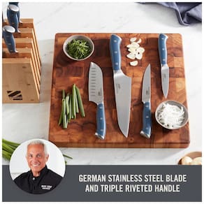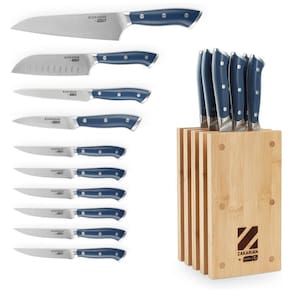 Este conjunto de blocos de facas de 11 peças Zakarian by Dash inclui todas as facas de que sua cozinha precisa, bem como um bloco de facas magnético para segurá las. AÇO ALEMÃO DE ALTA QUALIDADE As facas apresentam lâminas full tang feitas de aço alemão para maior durabilidade e corte. O aço resistente à corrosão é mais forte e mais durável do que outros materiais, resistindo a lascas e quebras e mantém a nitidez ao longo do tempo. CABO DE REBITE TRIPLO Prende com segurança a lâmina ao cabo para maior durabilidade e estabilidade. FÁCIL DE LIMPAR As ripas no Knife Block facilitam a limpeza do Knife Block. FACAS SEGURA PARA MÁQUINAS DE LAVAR LOUÇA Recomenda se lavar à mão para prolongar a vida útil das facas Marca: Não Informado