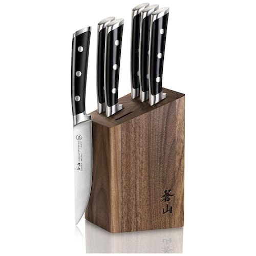 O Conjunto Inclui: 6 facas de bife com lâmina reta de 12,7 centímetros e um bloco de nogueira sólida. O cabo tem cerca de 13,97 centímetros de comprimento e a lâmina tem cerca de 12,7 centímetros de comprimento. A classificação na escala de dureza é HRC 59 , 2.