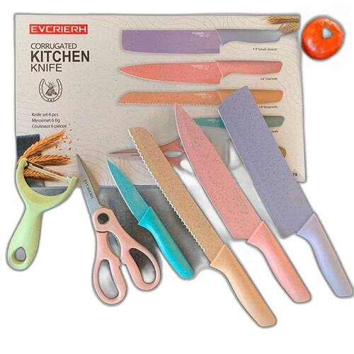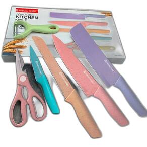 Conteúdo da Embalagem: - 1 Faca Chef 8 cm ; - 1 Faca Pão 8 cm ; - 1 Faca para descascar 3,5 cm ; - 1 Cutelo Pequeno 8 cm ; - 1 Descascador de cerâmica; - 1 Tesoura.