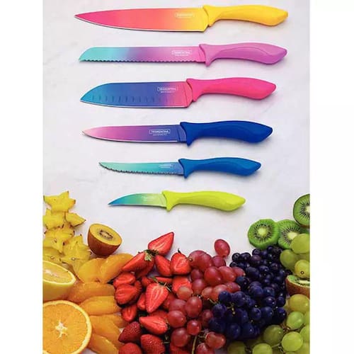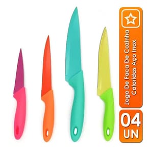 JOGO DE FACAS COLORIDAS 3 PEÇAS Um ótimo Kit de Facas que trará mais cor e alegria à sua cozinha! Além do toque especial das cores, também tem muita qualidade e corta super bem. CARACTERÍSTICAS: - Cores: Lilás, Verde, e Laranja; - Material da Lâmina: Aço inox; - Material do Cabo: Plástico; - Peso: 100g, CONTÉM: - 1 Faca Lilás de Pão 30,5cm; - 1 Faca Verde de Frutas 18cm; - 1 Faca Laranja do Chef 33cm.
