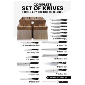 Excelente artesanato, tecnologia de ponta, elementos de design impressionantes e materiais premium. O desempenho máximo nunca foi tão bom a esse preço. Aço alemão de alto carbono importado, incrivelmente nítido e com nitidez nítida, com uma borda polida à mão de 14 a 16 graus por lado. Temperado com precisão e resistente a manchas. Este conjunto durará uma vida. Design famoso, com peso satisfatório, materiais premium e sensação de qualidade. As alças pretas de luxo importadas da pakkawood têm rebites triplos com uma alça que garante conforto e manobrabilidade. Laminado e polido para uma construção sanitária, perfeito para cozinhas movimentadas Projetado com perfeição na dureza 56 Rockwell e polido à mão para um acabamento acetinado. Cuidadosamente afunilado para maior dureza, flexibilidade e resistência mínima ao corte. Todas as facas essenciais para qualquer chef, completas em um impressionante bloco de madeira de nogueira artesanal. Inclui faca do chef, kiritsuke, santoku, talhar, cortar, pão, desossar, filé, utilidade, utilidade serrilhada, aparar, bico de pássaro e 6 facas para bife e afiar aço Marca: Não Informado