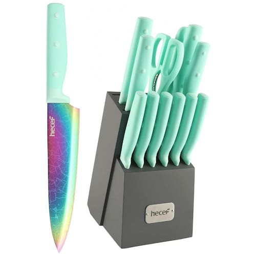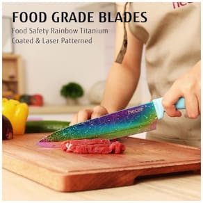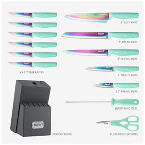 Alça elegante e ergonômica injetada com material PP TPR, esta alça rebitada tripla é resistente que nunca se desmonta e garante uma boa experiência na cozinha. Enquanto isso, a cor das alças é especialmente projetada para combinar com nosso bloco de facas e com a maior parte da cozinha. Aço inoxidável martensítico de alta qualidade O conjunto de facas é construído em aço inoxidável martensítico de alta qualidade 2CR13N com dureza Rockwell de 502 para maior resistência à corrosão e durabilidade notável. Cada faca foi construída com precisão para garantir uma sensação de aderência superior. Padrão de laser e revestimento de titânio arco íris este conjunto de facas de cozinha é processado com um belo revestimento de titânio arco íris na superfície da lâmina, a lâmina da faca aparecerá em cores diferentes sob diferentes ângulos de luz, é durável e notavelmente resistente à ferrugem que endurece a lâmina, aumenta as propriedades antiaderentes para um uso duradouro. ESCOLHA DE PRESENTE PERFEITA Este conjunto de facas vem em uma caixa de presente requintada e é o presente perfeito para família, entes queridos, amigos e pessoas em sua vida que adoram cozinhar. Ilumine uma cozinha monótona com um conjunto de facas de cozinha colorido e dê um visual à sua cozinha Marca: Não Informado