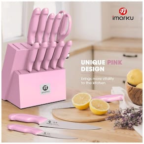 Este conjunto de facas imarku de 14 peças com bloco é indicado para preparo de alimentos em cozinhas domésticas ou profissionais, com lâminas de aço inoxidável japonês forjado e design ergonômico anti-derrapante para maior controle durante cortes. Inclui ângulo de fio otimizado e afiador integrado no bloco de madeira certificada FSC, facilitando manutenção e organização de facas chef, santoku, pão, fatiar, utilitária, aparar, steak serrilhadas e tesoura.