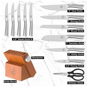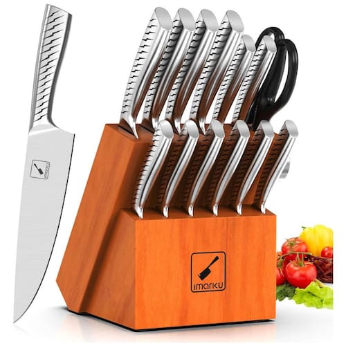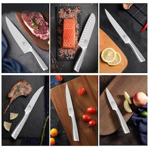 Conjunto de facas de cozinha de aço japonês superior Os talheres profissionais e de alta qualidade são forjados com aço AICHI, que oferece um excelente equilíbrio entre retenção de borda afiada e durabilidade, uma lâmina de aço de alta qualidade tornará a preparação da cozinha mais rápida e fácil. Dureza Rockwell 562 HRC, para lava louças. Conjunto de facas cobertas com recursos de preparação para corte de alimentos de cozinha Conjunto de facas de 14 peças adequado para casa ou restaurante com uma alça de anjo ergonômica bonita, use ângulos de 18 graus mais agudos na lâmina para uma face de corte ultra afiada para obter um corte mais rápido, mais preciso, mais , corte confortável e bem equilibrado de vegetais, carne, pão em fatias, cortes, balanços e até mesmo tem o peso para cortar ossos de galinha. Bloco de madeira de acácia natural e apontador O bloco de facas é feito de madeira de acácia sólida e natural, durável e para alimentos. Ele também possui um slot designado para cada pedaço de faca de cozinha, certifique se de colocar cada peça no correto, design de ventilação na parte inferior. Mais afiado embutido no bloco de conjunto de facas, você pode convenientemente fazer sua faca consistentemente manter a faca ultra afiada, economizar tempo e usar o ciclo de vida por mais tempo do que outras facas Marca: Não Informado