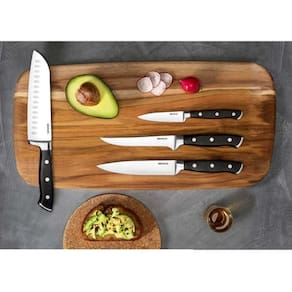 Facas sofisticadas, precisas e com excelente balanço. A linha Infinity é para quem entende que um bom corte significa tudo na hora de preparar sua refeição. Possui lâminas em aço inoxidável temperadas, proporcionando maior durabilidade para o fio. Na espiga da lâmina em aço inoxidável maciço é injetado o ABS, o que garante mais estabilidade. Possuem também, proteção para os dedos e rebites, ambos em aço inoxidável, proporcionando cortes perfeitos. Este kit é composto por faca do chef 8", faca de cozinha 5", faca para cozinha 8", faca para legumes 3" 1/2, chaira 8" e cepo de madeira. Lâmina em Aço Inox. Cabo ABS + Rebites Aço Inox