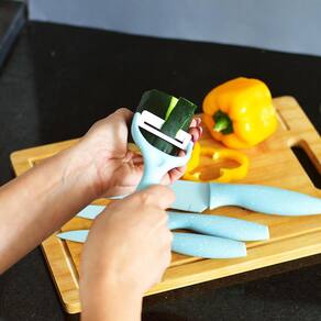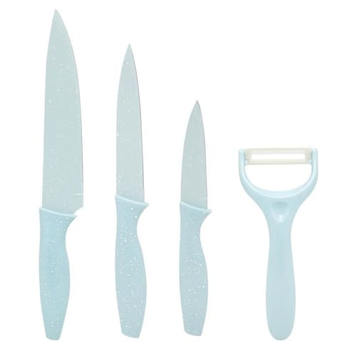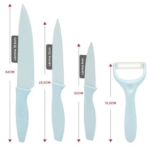 Conjunto de Facas Inox Candy Color 4 Peças com Descascador COR: AZUL Faqueiro com as principais facas para deixar sua cozinha ainda mais completa, confeccionada em aço inox de alta qualidade possui cabo ergonômico que se encaixa melhor na mão dando mais firmeza na hora do manuseio, além das facas esse kit inclui um descascador de legumes com lamina de cerâmica super afiada.