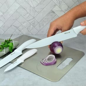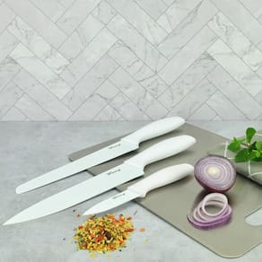 Conjunto de Facas Inox Coloridas 3 Peças COR: BRANCO Faqueiro com as facas essenciais para a sua cozinha, confeccionadas em aço inox de alta qualidade possui cabo ergonômico que se encaixa melhor na mão dando mais firmeza na hora do manuseio, leve a alegria das cores para a sua cozinha, 4 opções azul, coral, cinza e rosa.
