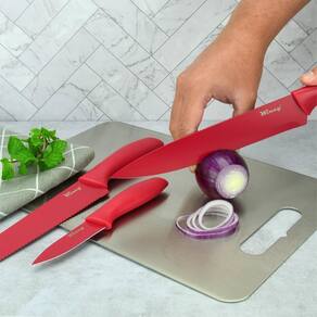 Faqueiro com as facas essenciais para a sua cozinha, confeccionadas em aço inox de alta qualidade possui cabo ergonômico que se encaixa melhor na mão dando mais firmeza na hora do manuseio, leve a alegria das cores para a sua cozinha, 4 opções azul, coral, cinza e rosa.