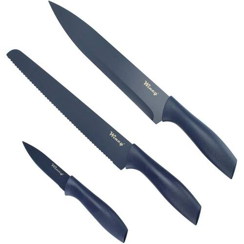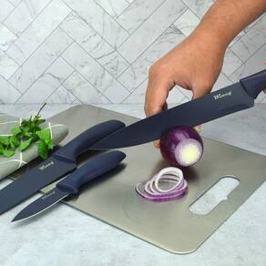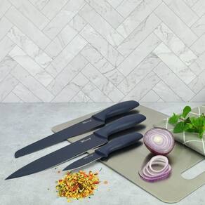 Conjunto de facas inox coloridas 3 peças Cor: azul marinho Faqueiro com as facas essenciais para a sua cozinha, confeccionadas em aço inox de alta qualidade possui cabo ergonômico que se encaixa melhor na mão dando mais firmeza na hora do manuseio, leve a alegria das cores para a sua cozinha, 4 opções azul, coral, cinza e rosa.
