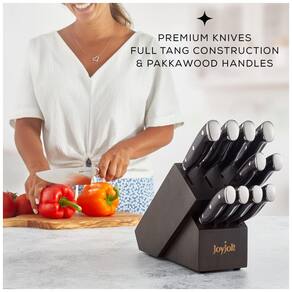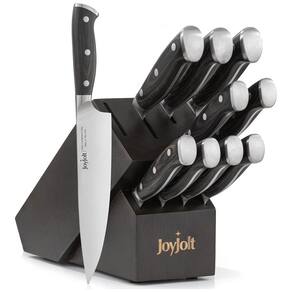 ÚTIL COM ESTILO Nossos jogos de facas para cozinha com bloco podem não ser forjados no fogo, mas SÃO totalmente forjados. Portanto, eles são fortes, duradouros e com o peso e a sensação de mão que você espera de qualquer conjunto de facas de chefs profissionais. E as alças pretas Pakkawood combinam com o seu próprio material de cozinha MAIS RESISTENTE QUE A MAIORIA Forjada em aço alemão de alto carbono x50CrMoV15 56 HRC Rockwell H. Rating, esta é possivelmente a melhor faca para durar anos com boa retenção de borda com 15 de cromo para maior resistência à corrosão. A alça rebitada tripla Full Tang está firmemente travada no lugar e não se solta. Graças a esta resistência incrível, é definitivamente um conjunto de facas para lava louças COM ZENAMENTO DE FACAS ELEVADO O porta faca de cozinha tem 4 pés de borracha para evitar arranhões ou deslizamento na bancada. Mas há uma razão mais importante. Fluxo de ar Este organizador de facas é elevado com altura suficiente para evitar uma bagunça pegajosa e úmida por baixo e para evitar o acúmulo anti higiênico Marca: Não Informado