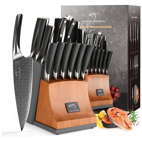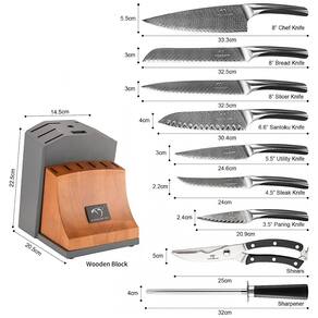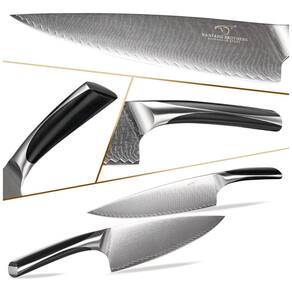 DESIGN DE QUALIDADE As facas são fabricadas com lâminas de aço damasco superior de 67 camadas com núcleo de aço VG10 para precisão e precisão. Dureza HRC 60 2 para nitidez excepcional, retenção de borda. Alça de design curvo oferece conforto e suporte. DURÁVEL E FÁCIL DE LIMPAR O design integrado da lâmina e da haste não é fácil de quebrar, e durável. Garante desempenho duradouro e fácil de limpar. Você pode economizar muito tempo na limpeza. FÁCIL DE CUIDAR E ZENAR A parte do bloco de madeira é feita de mandschurica fraxinus natural durável, e os slots de faca são mais fáceis de inserir e remover, s e higiênicos. Use mais Marca: Não Informado
