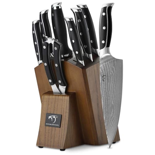 AÇO DAMASCO VG10 As facas são fabricadas com lâminas de aço damasco superior de 67 camadas com núcleo de aço VG10 para precisão e precisão. Dureza HRC 602 para nitidez excepcional, retenção de borda. Alça ABS de design curvo oferece conforto e suporte. DURÁVEL E FÁCIL DE LIMPAR O design integrado da lâmina e da haste não é fácil de quebrar, e durável. Garante desempenho duradouro e fácil de limpar. Você pode economizar muito tempo na limpeza. BLOCO DE FACAS PARA FÁCIL ZENAMENTO A parte do bloco de madeira é feita de carvalho natural durável, e o assento oco da faca é mais fácil de inserir e remover, e higiênico. Use mais Marca: Não Informado