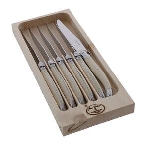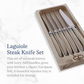 - Conjunto de facas para bife – coloque a mesa com estilo com estas chiques facas de bife Laguiole da Jean Dubost. Este conjunto possui seis facas de aço inoxidável com alças ABS brancas peroladas, complementando quase qualquer tema de cozinha.